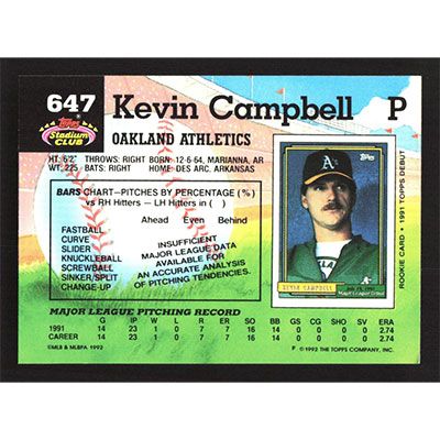 This is a 1992 Stadium Club Kevin Campbell baseball card. The card is #647 and pictures show condition.