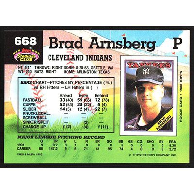 This is a 1992 Stadium Club Brad Arnsberg baseball card. The card is #668 and pictures show condition.