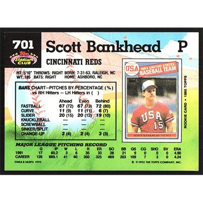 This is a 1992 Stadium Club Scott Bankhead baseball card. The card is #701 and pictures show condition.