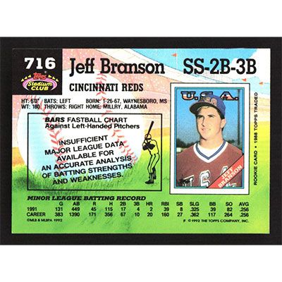 This is a 1992 Stadium Club Jeff Branson baseball card. The card is #716 and pictures show condition.