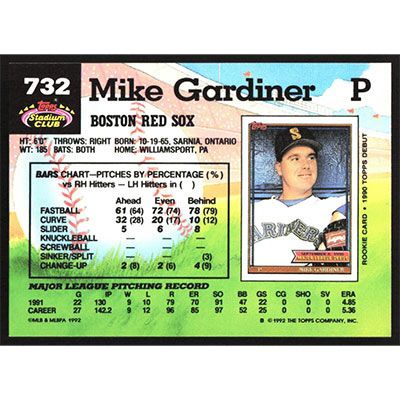 This is a 1992 Stadium Club Mike Gardiner baseball card. The card is #732 and pictures show condition.