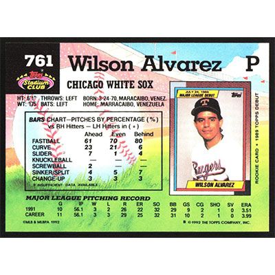 This is a 1992 Stadium Club Wilson Alvarez baseball card. The card is #761 and pictures show condition.