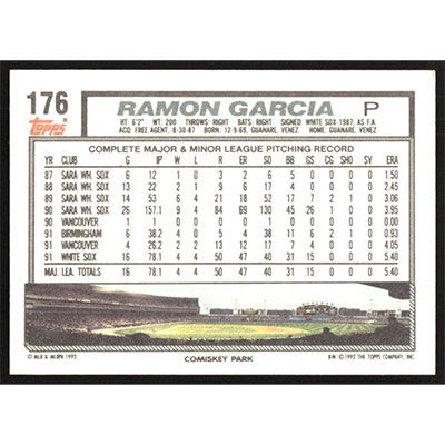 This is a 1992 Topps Ramon Garcia baseball card. The card is #176 and pictures show condition.