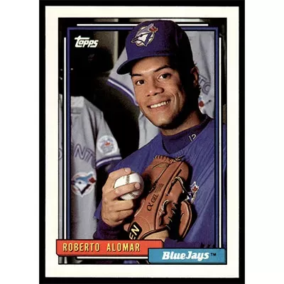 This is a 1992 Topps Roberto Alomar baseball card. The card is #225 and pictures show condition.