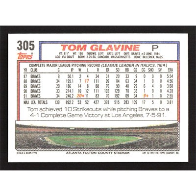 This is a 1992 Topps Tom Glavine baseball card. The card is #305 and pictures show condition.