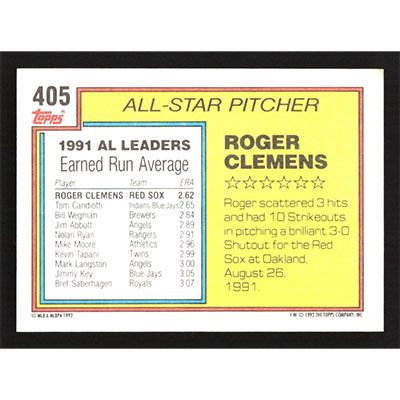 This is a 1992 Topps Roger Clemens All-Star baseball card. The card is #405 and pictures show condition.