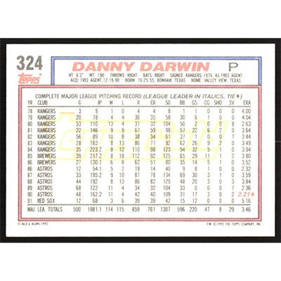 This is a 1992 Topps Gold Danny Darwin baseball card. The card is #324 and pictures show condition.