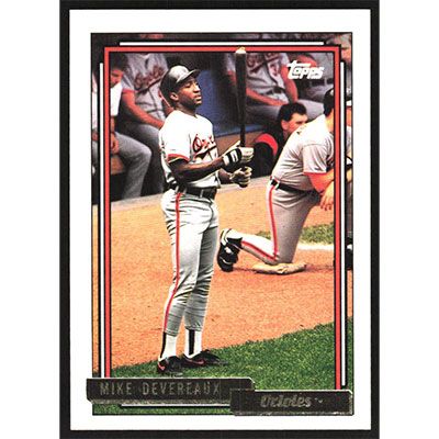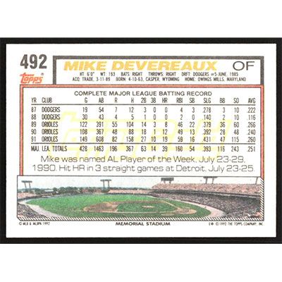 This is a 1992 Topps Gold Mike Devereaux baseball card. The card is #492 and pictures show condition.
