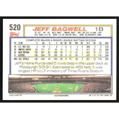 This is a 1992 Topps Gold Jeff Bagwell baseball card. The card is #520 and pictures show condition.