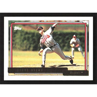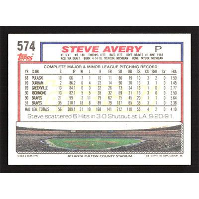 This is a 1992 Topps Gold Steve Avery baseball card. The card is #574 and pictures show condition.