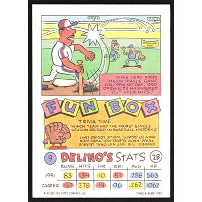 This is a 1992 Topps Kids Delino DeShields baseball card. The card is #9 and pictures show condition.