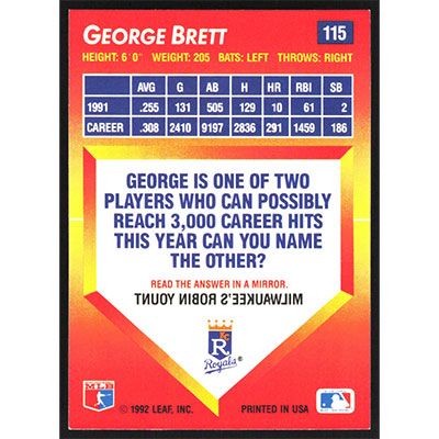 This is a 1992 Triple Play George Brett baseball card. The card is #115 and pictures show condition.