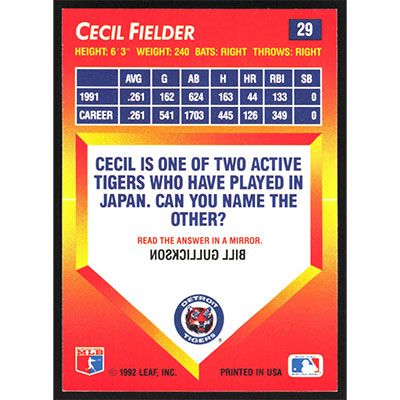 This is a 1992 Triple Play Cecil Fielder baseball card. The card is #29 and pictures show condition.