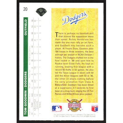 This is a 1992 Upper Deck Tom Goodwin Star Rookie baseball card. This card has been signed, in blue, by Tom Goodwin, and is guaranteed authentic by Ballcardz.com. The card is #20 and pictures show condition.