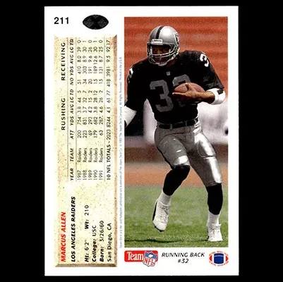 This is a 1992 Upper Deck Marcus Allen football card. The card is #211 and is in NM-MT condition.