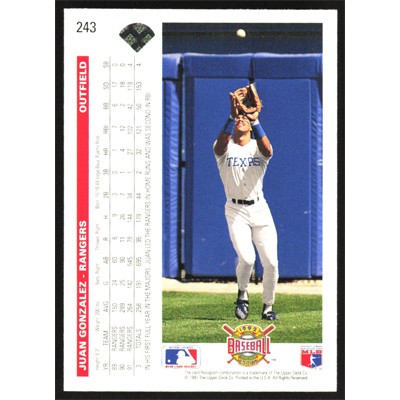 This is a 1992 Upper Deck Juan Gonzalez baseball card. The card is #243 and pictures show condition.