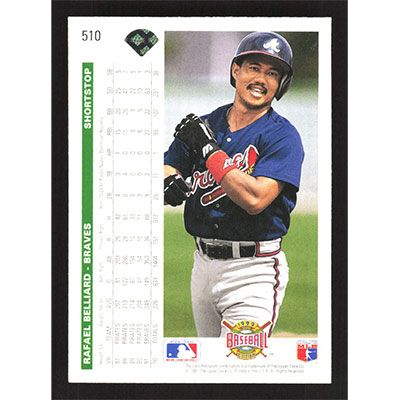 This is a 1992 Upper Deck Rafael Belliard autographed baseball card. This card has been signed, in blue, by Rafael Belliard, and is guaranteed authentic by Ballcardz.com. The card is #510 and pictures show condition.