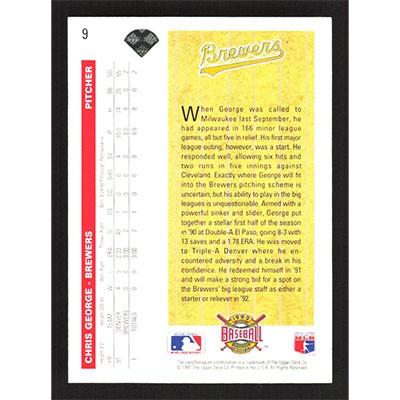 This is a 1992 Upper Deck Chris George Star Rookie baseball card. The card is #9 and pictures show condition.