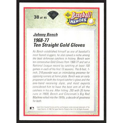This is a 1992 Upper Deck Bench/Morgan Heroes Johnny Bench baseball card. The card is #38 and pictures show condition.