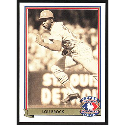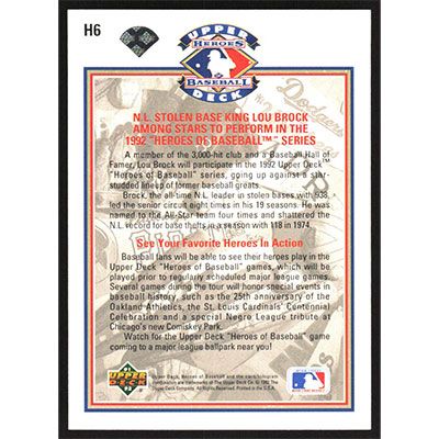 This is a 1992 Upper Deck Heroes of Baseball Lou Brock baseball card. The card is #H6 and pictures show condition.