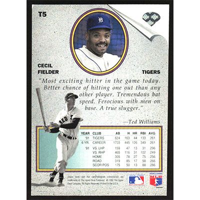 This is a 1992 Upper Deck Ted Williams' Best Cecil Fielder baseball card. The card is #T5 and pictures show condition.