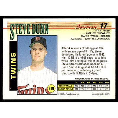 This is a 1993 Bowman Steve Dunn baseball card. The card is #17 and pictures show condition.