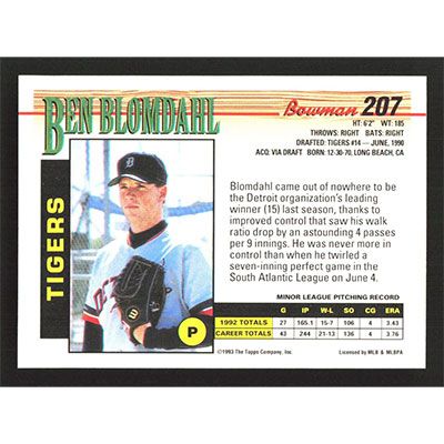 This is a 1993 Bowman Ben Blomdahl baseball card. The card is #207 and pictures show condition.