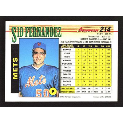 This is a 1993 Bowman Sid Fernandez baseball card. The card is #214 and pictures show condition.