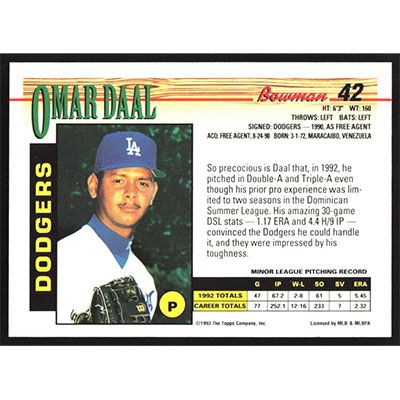 This is a 1993 Bowman Omar Daal baseball card. The card is #42 and pictures show condition.