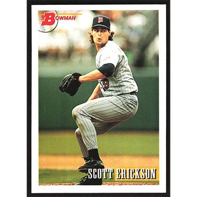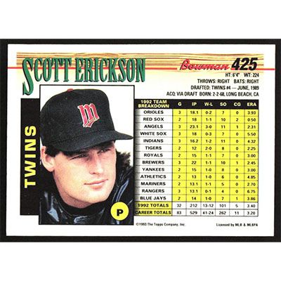 This is a 1993 Bowman Scott Erickson baseball card. The card is #425 and pictures show condition.