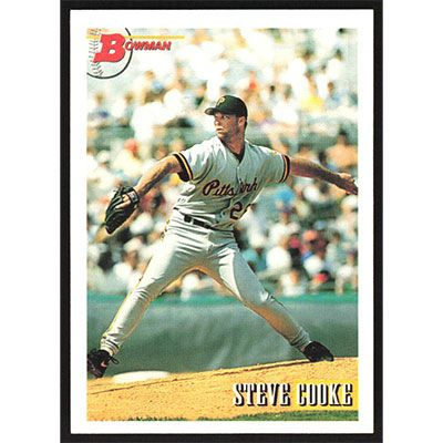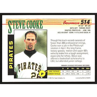 This is a 1993 Bowman Steve Cooke baseball card. The card is #514 and pictures show condition.