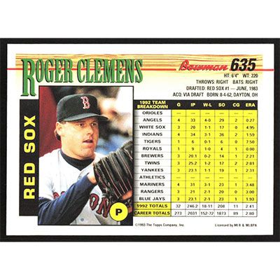 This is a 1993 Bowman Roger Clemens baseball card. The card is #635 and pictures show condition.
