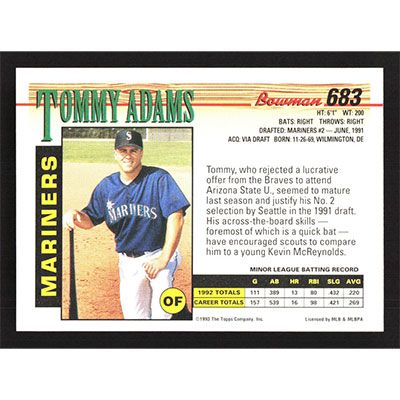 This is a 1993 Bowman Tommy Adams baseball card. The card is #683 and pictures show condition.