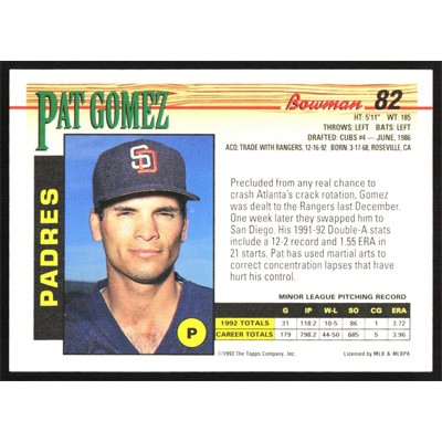 This is a 1993 Bowman Pat Gomez baseball card. The card is #82 and pictures show condition.
