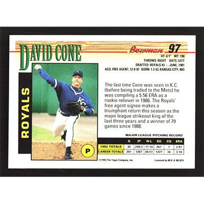 This is a 1993 Bowman David Cone baseball card. The card is #97 and pictures show condition.