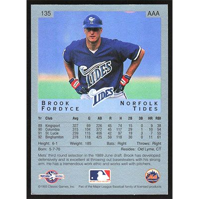 This is a 1993 Classic/Best Brook Fordyce baseball card. The card is #135 and pictures show condition.