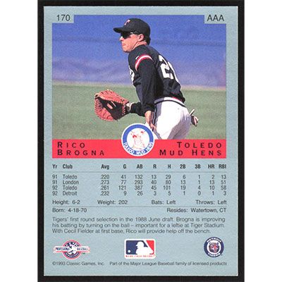 This is a 1993 Classic/Best Rico Brogna baseball card. The card is #170 and pictures show condition.