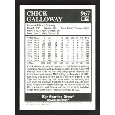 This is a 1993 Conlon Collection TSN Chick Galloway baseball card. The card is #967 and pictures show condition.