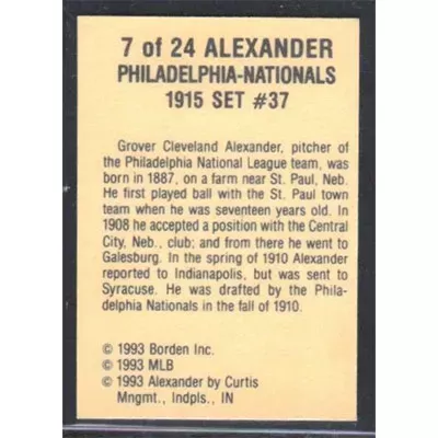 This is a 1993 Cracker Jack 1915 Reprints Grover Cleveland Alexander baseball card. The card is #7 and pictures show condition. Team(s): Philadelphia Phillies