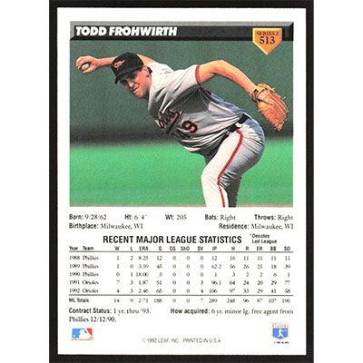 This is a 1993 Donruss Todd Frohwirth baseball card. The card is #513 and pictures show condition.