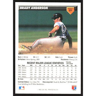 This is a 1993 Donruss Brady Anderson baseball card. The card is #89 and pictures show condition.