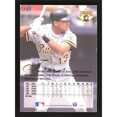 This is a 1993 Flair Carlos Garcia baseball card. The card is #112 and pictures show condition.