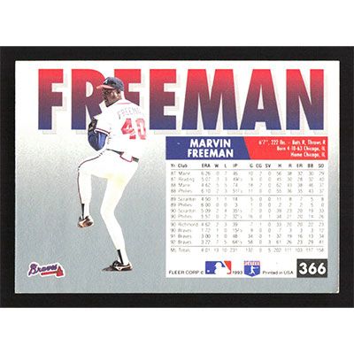 This is a 1993 Fleer Marvin Freeman autographed baseball card. This card has been signed, in blue, by Marvin Freeman, and is guaranteed authentic by Ballcardz.com. The card is #366 and pictures show condition.