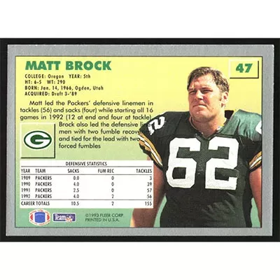 This is a 1993 Fleer Matt Brock football card. The card is #47 and pictures show condition.
