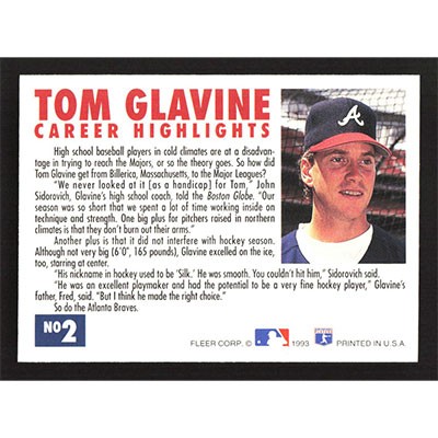 This is a 1993 Fleer Tom Glavine Career Highlights Tom Glavine Facing Left baseball card. The card is #2 and pictures show condition. Team(s): Atlanta Braves