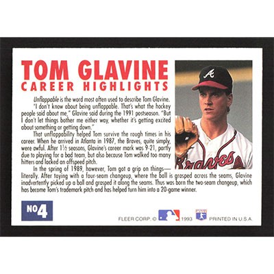 This is a 1993 Fleer Tom Glavine Career Highlights Tom Glavine Facing Left baseball card. The card is #4 and pictures show condition. Team(s): Atlanta Braves