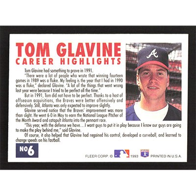 This is a 1993 Fleer Tom Glavine Career Highlights Tom Glavine baseball card. The card is #6 and pictures show condition.