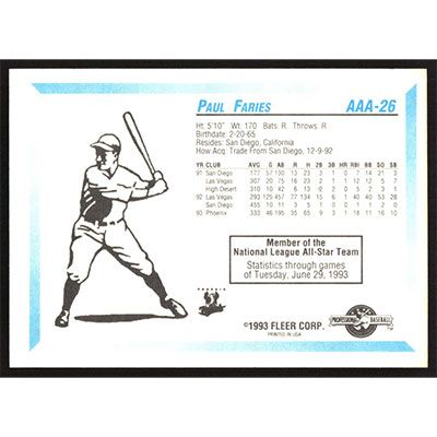 This is a 1993 Fleer/ProCards Triple A All-Stars Paul Faries baseball card. The card is #AAA-26 and pictures show condition.