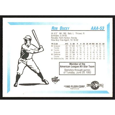 This is a 1993 Fleer/ProCards Triple A All-Stars Rob Ducey baseball card. The card is #AAA-53 and pictures show condition. Team(s): Oklahoma City 89ers
