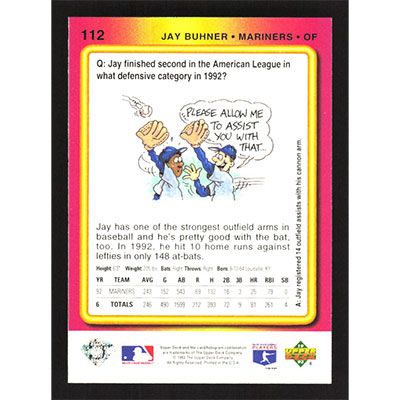 This is a 1993 Fun Pack Jay Buhner baseball card. The card is #112 and pictures show condition.